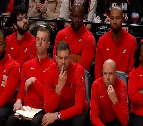 不过小杨继续拼抢,扣篮不中后,拿到进攻篮板,再次上篮,这次裁判给了打手犯规。小杨上罚球线,罕见两罚不中,而紧接着下一个回合中,小杨在进攻中造成对手犯规,再次获得两次罚球,但遗憾的是,再次两罚全失。也就是说,短短1分钟内,小杨扣篮扣飞+4罚全丢,镜头给了开拓者教练组,7个助教全都是目瞪口呆,斯普内特直接闭眼,没眼看啊!