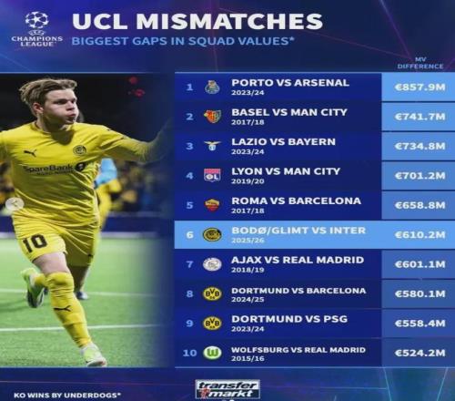 赛后数据刺眼得让人心寒:国米全队身价4.1亿欧元,首发总身价更是高达数亿,而博德闪耀全队身价仅4260万欧元。两队身价差高达6.1亿欧元,这在欧冠历史上足以排进“以弱胜强”的前十名。