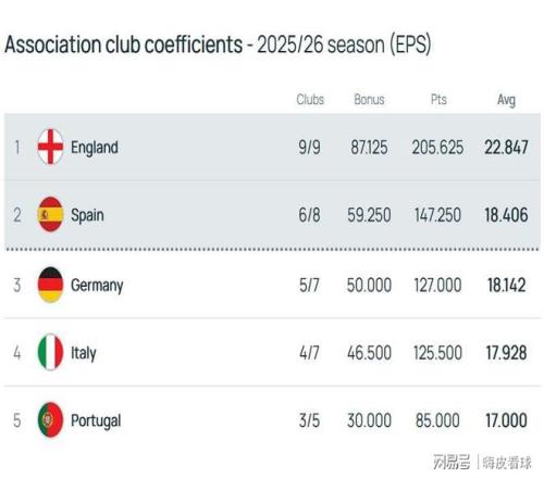 除了英超之外,西甲、德甲和意甲分别排在第二名到第四名,首尾差距不到0.5分,只要比其他联赛多一队晋级下一个阶段,就能抹平这个差距。谁能获得另外一个欧冠奖励名额,还是有些悬念的,三大联赛将会为前两名展开激烈的争夺。