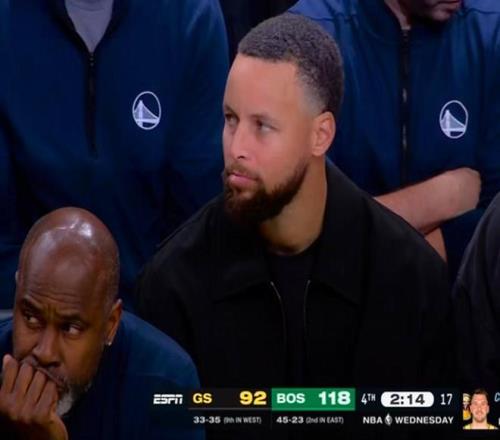 接着是比赛末节失去悬念时,现场导播第一时间将镜头切向坐在场边替补席的库里,后者撇嘴看起来很不开心。