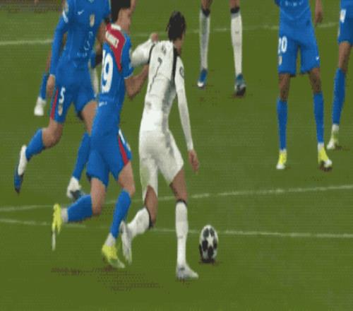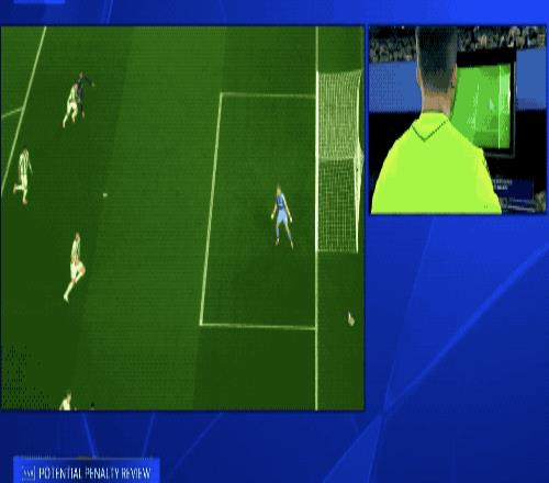 上半场补时阶段,费尔明传中,特里皮尔在拉菲尼亚的身后,不得不拉拽犯规。VAR介入,裁判认定特里皮尔犯规,判罚点球。