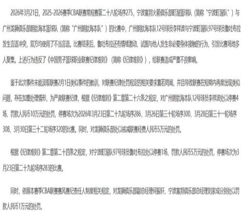 3月21日号下午,CBA联赛分别开出了6张罚单,以李祥波和鲁吐布拉在“比赛结束后发生言语冲突,双方均使用了不当言语,鲁吐布拉还有情绪激动、试图与他人发生非必要身体接触的行为,引发比赛场地多人聚集,给联赛造成严重不良影响”为由,对李祥波处以停赛4场,罚款10万的处罚,鲁吐布拉停赛1场,罚款5万。