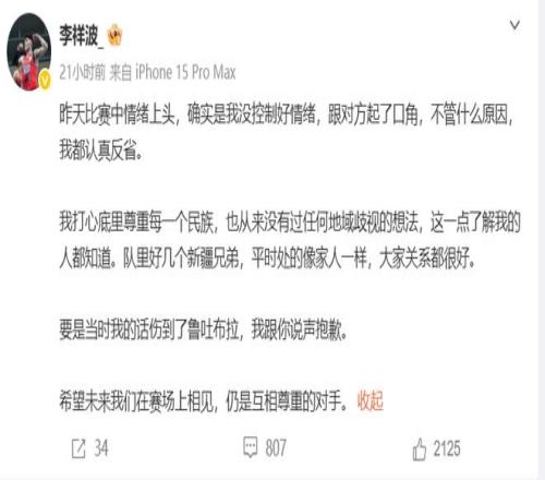 赛后刘家成和鲁吐布拉都在个人社媒上发表了对李祥波“地域性攻击”的不满声明,强烈要求李祥波出来道歉;
