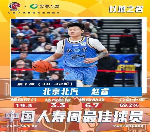 北京时间3月31日,CBA官宣常规赛第10周的周最佳奖项,中国男篮队长赵睿迎来久违的爆发,他率领北京本周3战全胜,且贡献接近7成三分准星,场均接近19+3+7表现神勇,让他时隔7年生涯第2次当选本土周最佳,广厦外援塔克场均接近26+7+9当选外援周最佳。