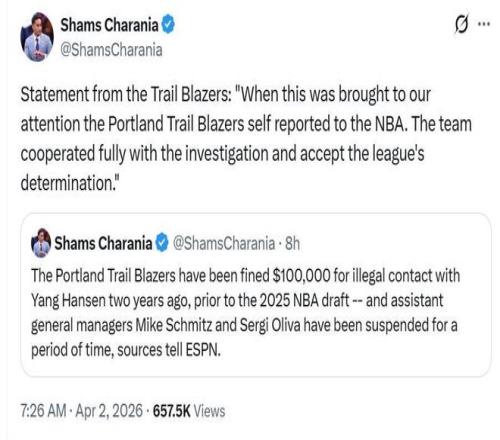 消息最先由Shams曝出,开拓者因两年前(2023年12月)与杨瀚森违规接触被罚款10万美元。