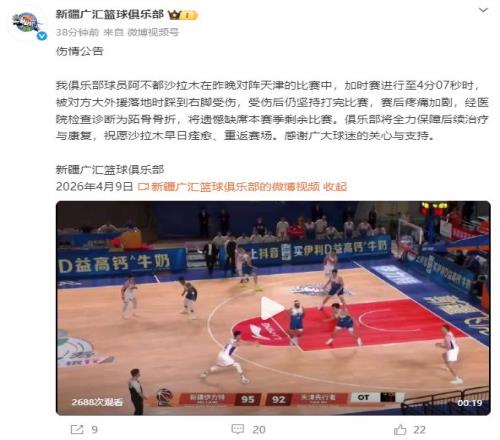 新疆男篮官宣阿不都沙拉木受伤,赛季报销。