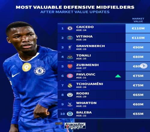 北京时间4月12日,德转列出了世界足坛后腰球员身价前10,切尔西的莫伊塞斯-凯塞多和巴黎圣日耳曼的维蒂尼亚同以1.1亿欧元并列第一。