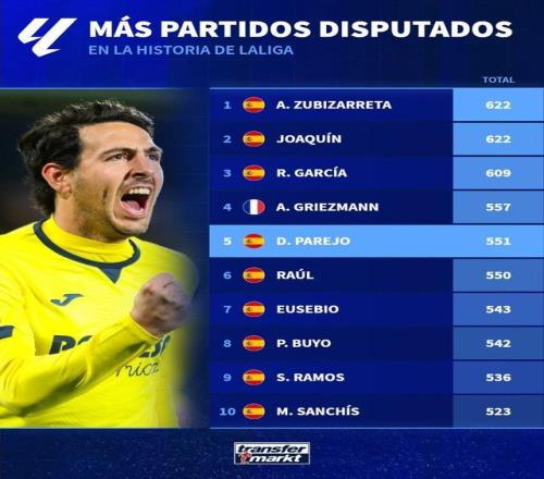根据德转的统计,本场比赛是帕雷霍生涯至今出战的第551场西甲比赛,他也就此超越了皇马的传奇球星劳尔,成为西甲历史出场次数第五多的球员。