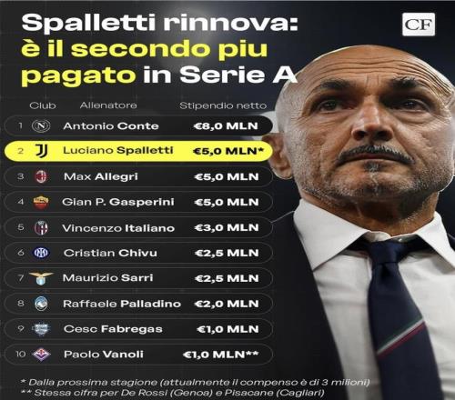但最大的争议出现在斯帕莱蒂身上。 去年10月他接手尤文时,年薪还是300万欧元的级别。就在4月10日,尤文官方突然宣布和他续约到2028年,意媒普遍确认新合同年薪直接破500万,把他强行抬进了薪资第二梯队。尴尬的是,尤文现在31轮只拿到57分排在第五,目前的成绩根本撑不起这涨出来的几百万。尤文这波操作,更像是在为未来两年的重建提前砸钱画饼,而不是为眼下的战绩买单。