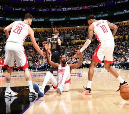 第三节史密斯连得4分,火箭队55-54实现反超。湖人加强了对杜兰特的防守,同时在进攻端多点开花,分差再次被拉开。上半场得到20分的杜兰特,在第三节单节仅仅依靠罚球拿到1分。三节比赛结束时,湖人队75-68领先火箭7分。