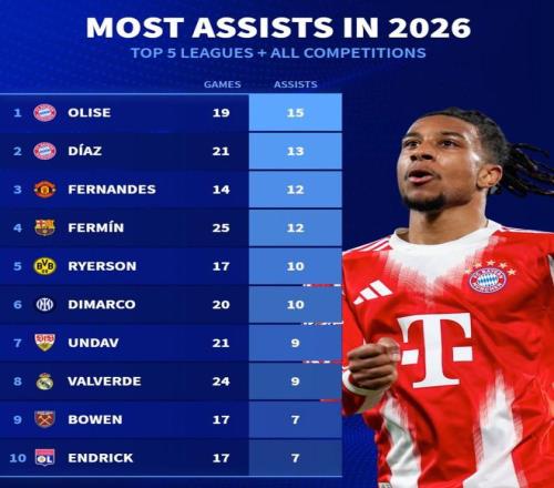 北京时间4月23日,德转统计出了2026年欧洲五大联赛+所有赛事助攻最多的10名球员,奥利塞以19场助攻15次的数据高居第一,他的队友路易斯-迪亚斯13次助攻排名第二,布鲁诺-费尔南德斯12次排名第三。