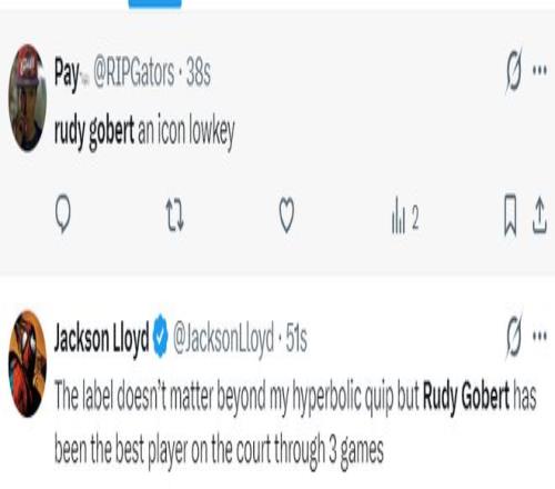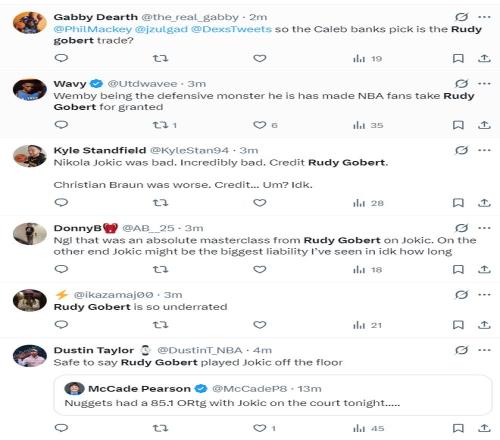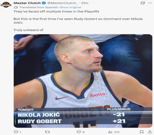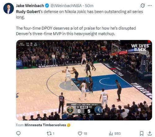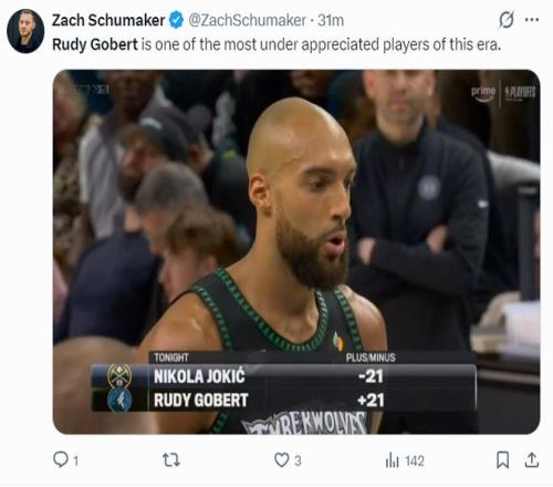 NBA记者:戈贝尔这轮系列赛限制约基奇非常出色,这位四届DPOY成功压制了三届MVP,他的表现值得高度赞扬。