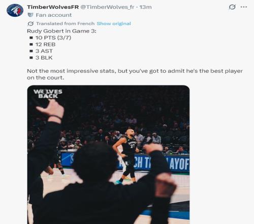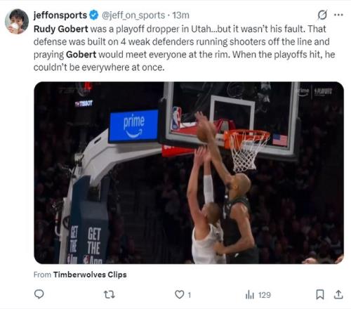 美媒:戈贝尔在爵士时期多次拿到DPOY可季后赛发挥不佳,那实际上不是他的原因,那支爵士队另外的四人防守能力都偏弱,如今的森林狼戈贝尔身边也有出色防守者,这让他的能力发挥到极致,他无处不在。