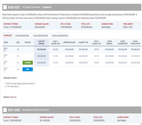 戈贝尔职业生涯前期拿到了四次DPOY,但在季后赛总是被打爆落下话柄,他是以1换10来到森林狼,他先是一份五年2.05亿的顶薪,随后又跟森林狼续约三年1.095亿,本赛季薪水3500万,换言之他八年合同价值3.145亿也算联盟最高薪的内线之一了。