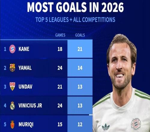 2026年五大联赛+所有赛事进球榜:凯恩21球第1,亚马尔14球第2